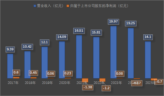 2025年,惠发食品实现营业收入约14.1亿元,同比下降26.78%;扣除与主营业务无关的业务收入和不具备商业实质的收入后的营业收入约13.84亿元,同比下降27.16%;归属于上市公司股东的净利润约-0.7亿元,同比亏损额进一步扩大;归属于上市公司股东的扣除非经常性损益的净利润同样亏损,且亏损额同比进一步扩大,说明公司主营业务的造血能力在持续恶化。